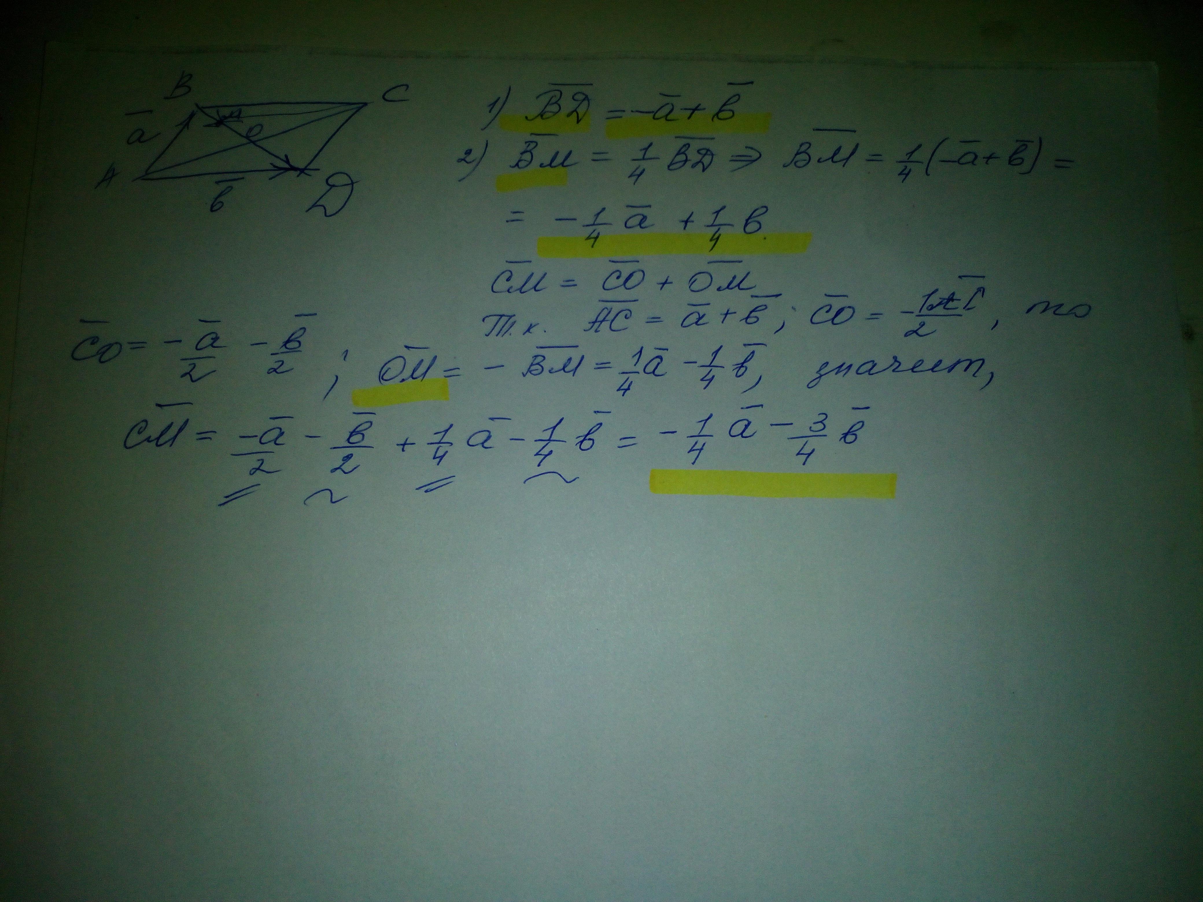 ABCD- параллелограмм, диагональ пересекается в точке О. Точка М это середина BO. Векторы BD, BM, CM, выразите векторы AB=a и AD=b.