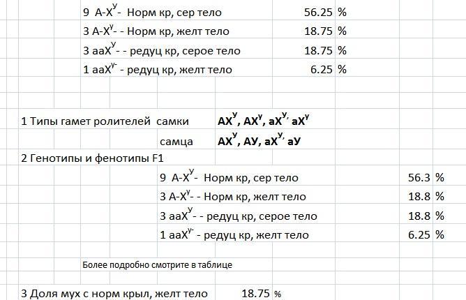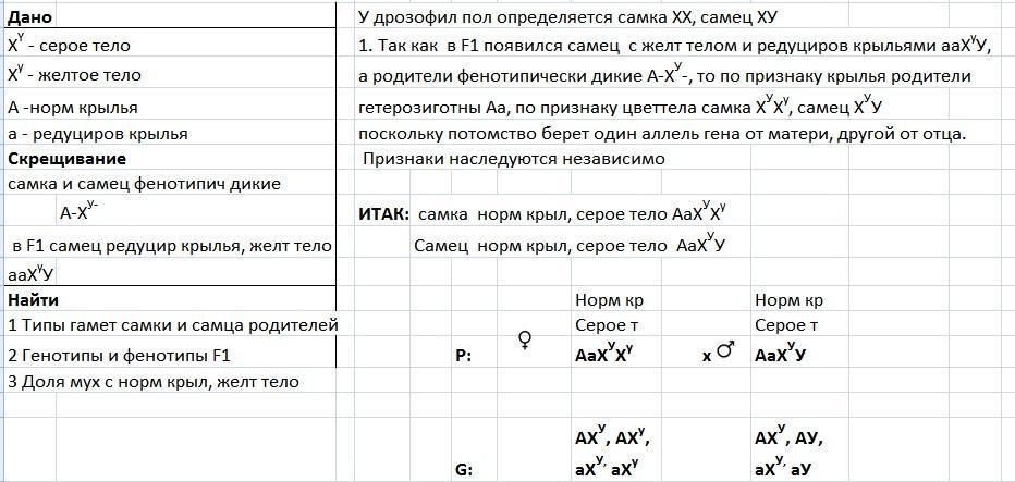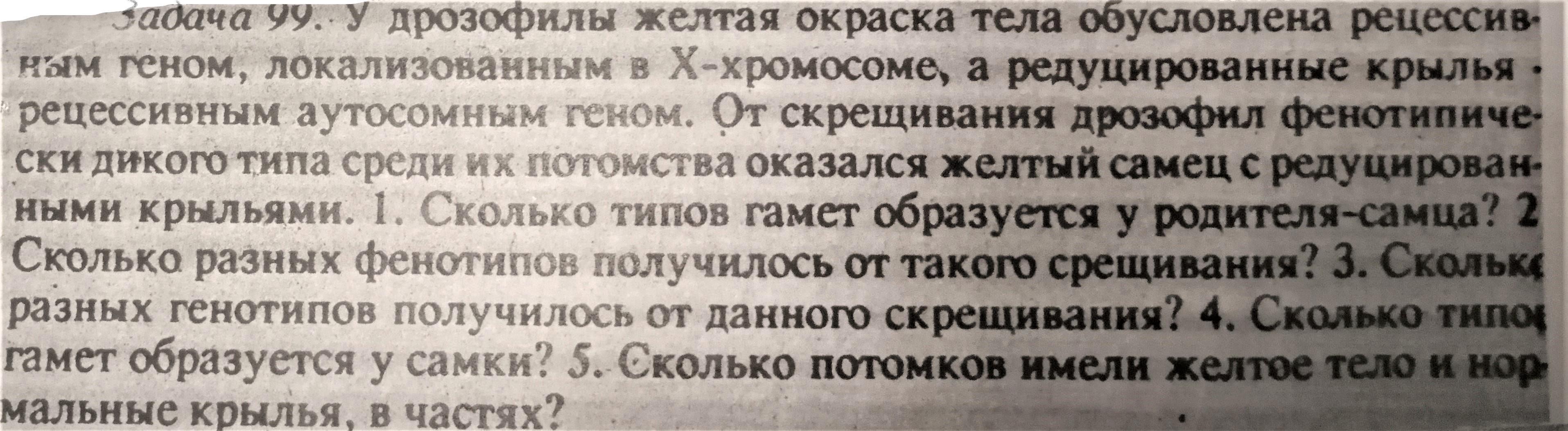 Пожалуйста, помогите! 40 баллов! У дрозофилы желтая окраска тела обусловлена рецессивным геном, локализированных в X хромосоме, а редуцированные крылья рецессивным аутсомным геном. От скрещивания дрозофил фенотипически дикого типа среди их потомства оказался желтый самец с редуцированными крыльями. 1. Сколько типов гамет образуется у родителя самца? 2.Сколько разных фенотипов получилось от такого скрещивания? 3. Сколько разных фенотипов получилось от такого скрещивания? 4.Сколько типов гамет образуется у самки? 5.Сколько потомков имели желтое тело и нормальные крылья в частях?