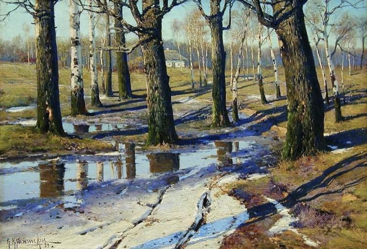 Сделайте описание картины Крыжицкого «Весна» с терминами из списка: колорит, ритм, перспектива, графика, портрет, пейзаж, скульптура, пропорции, живопись. Плиз!