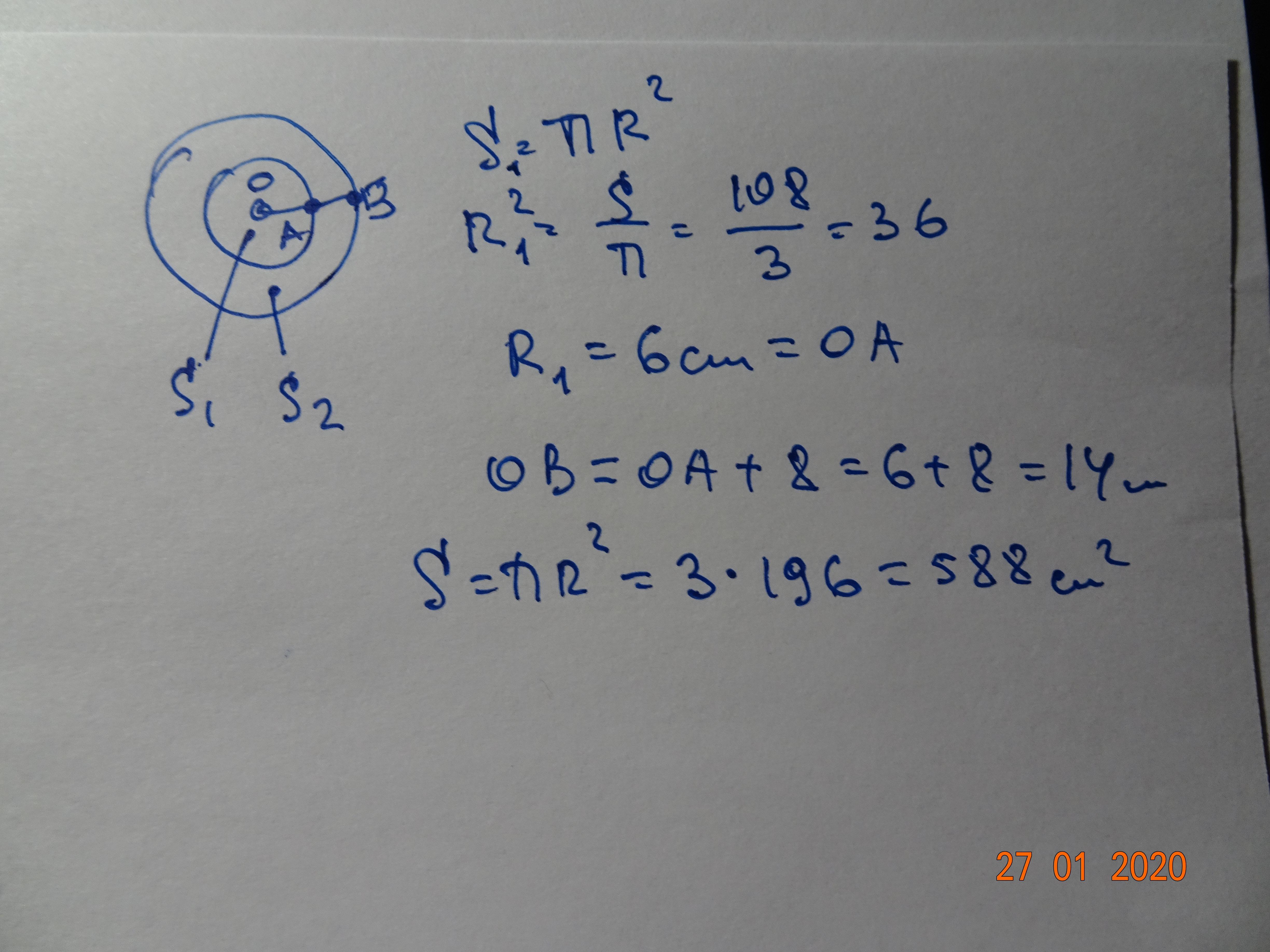Площадь меньшего круга равна 108см2. Отрезок AB = 8 см.
