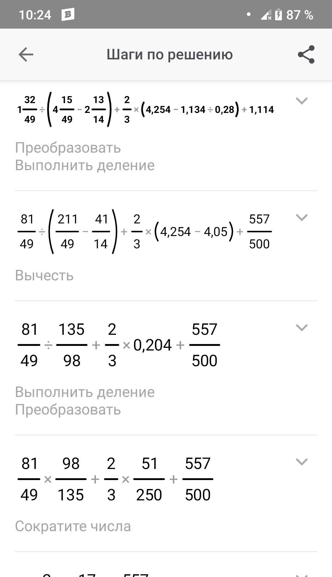 1 32/49 : (4 15/49 - 2 13/14) + 2/3 × (4,254 - 1,134 : 0,28 ) + 1,114 = ?