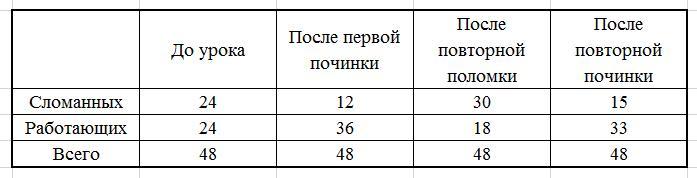 В первую починку фиксики починили половину сломанных приборов. Значит до урока было 12·2 = 24 сломанных и 48-24 = 24 работающих прибора.