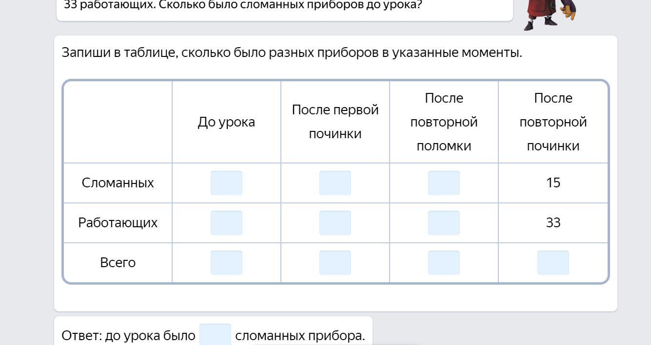 у профессора Чудакова в лаборатории было много удивительных приборов. Некоторые из них были сломаны. На уроке Дедусу и его ученикам удалось починить половину сломанных приборов. Однако после урока профессор провёл эксперимент и половина всех работающих приборов сломалось. После эксперимента фиксики опять починили половину всех сломанных приборов. В итоге осталось 15 сломанных приборов и 33 работающих. Сколько было сломанных приборов до урока?