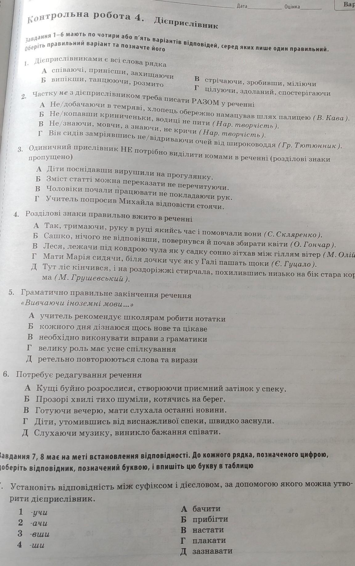 Відповідь: 1.в 2.а 3.г 4.б 5.б 6.д 7: 1г 2а 3в 4 д