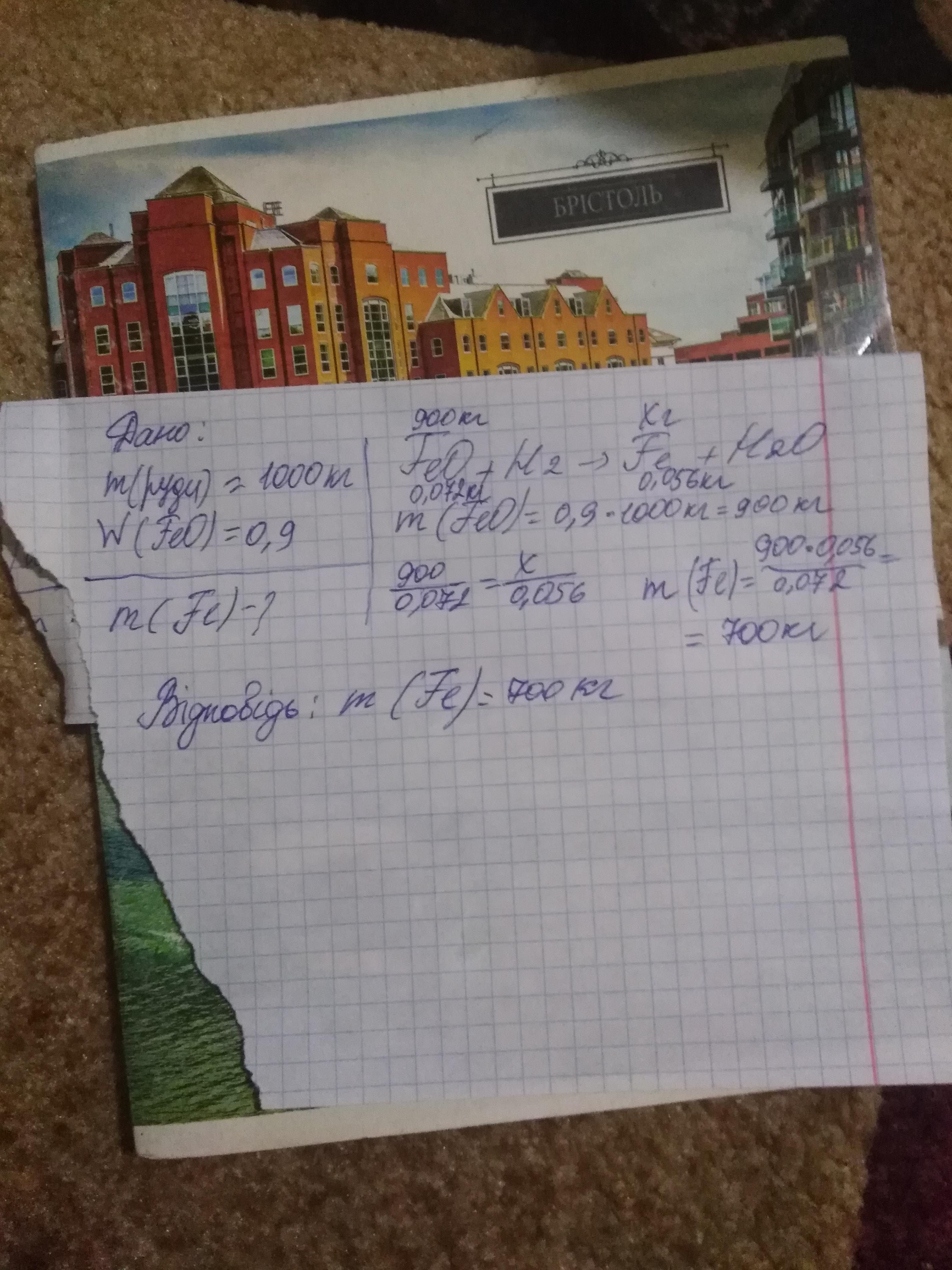 Яку масу заліза можна отримати під час відновлення 1000 кг руди, що містить 0,9 масової частки FeO.