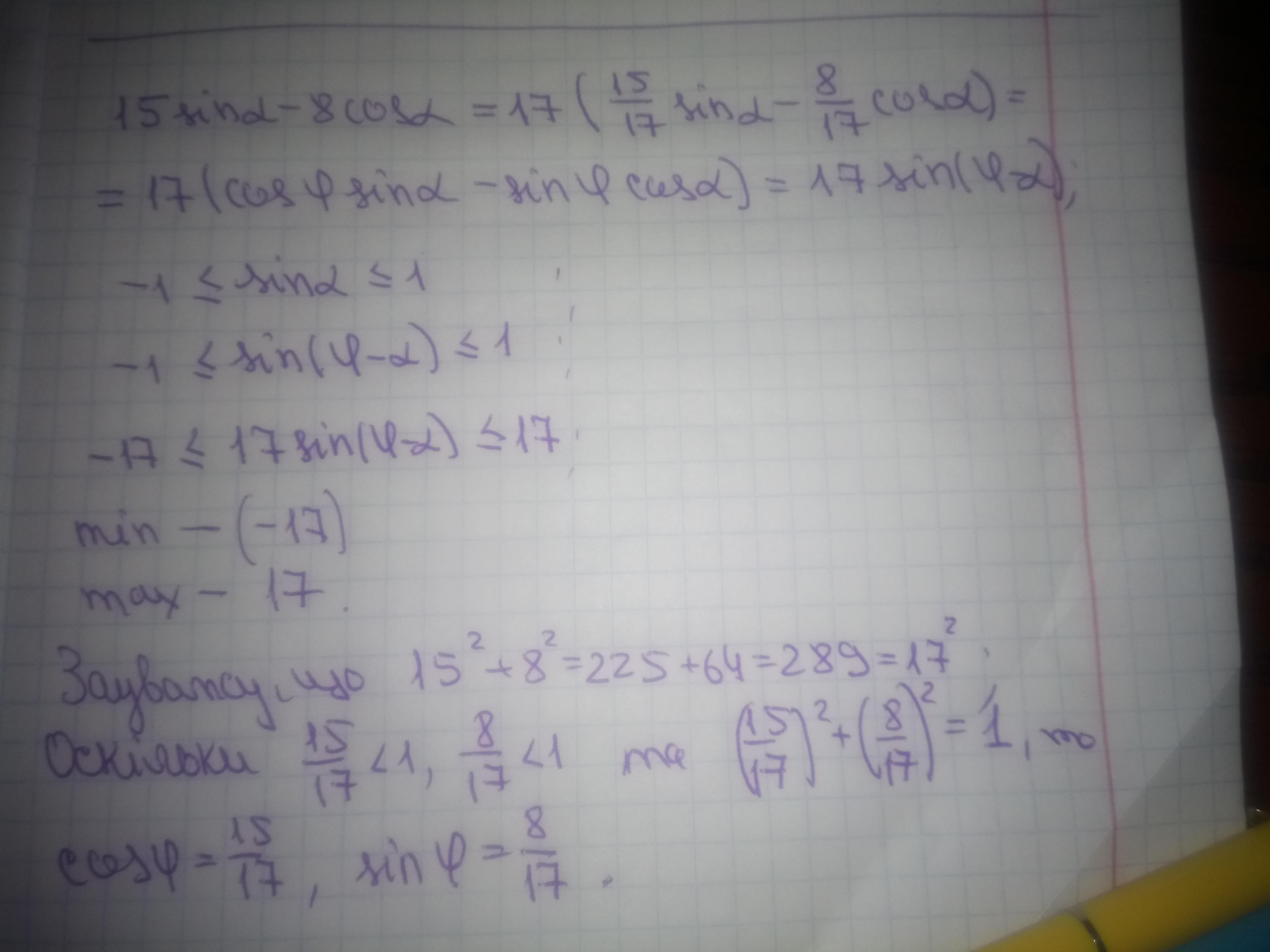 Проще всего так : выражение равно 17*((15/17)*sin(a)-(8/17)cos(a))=