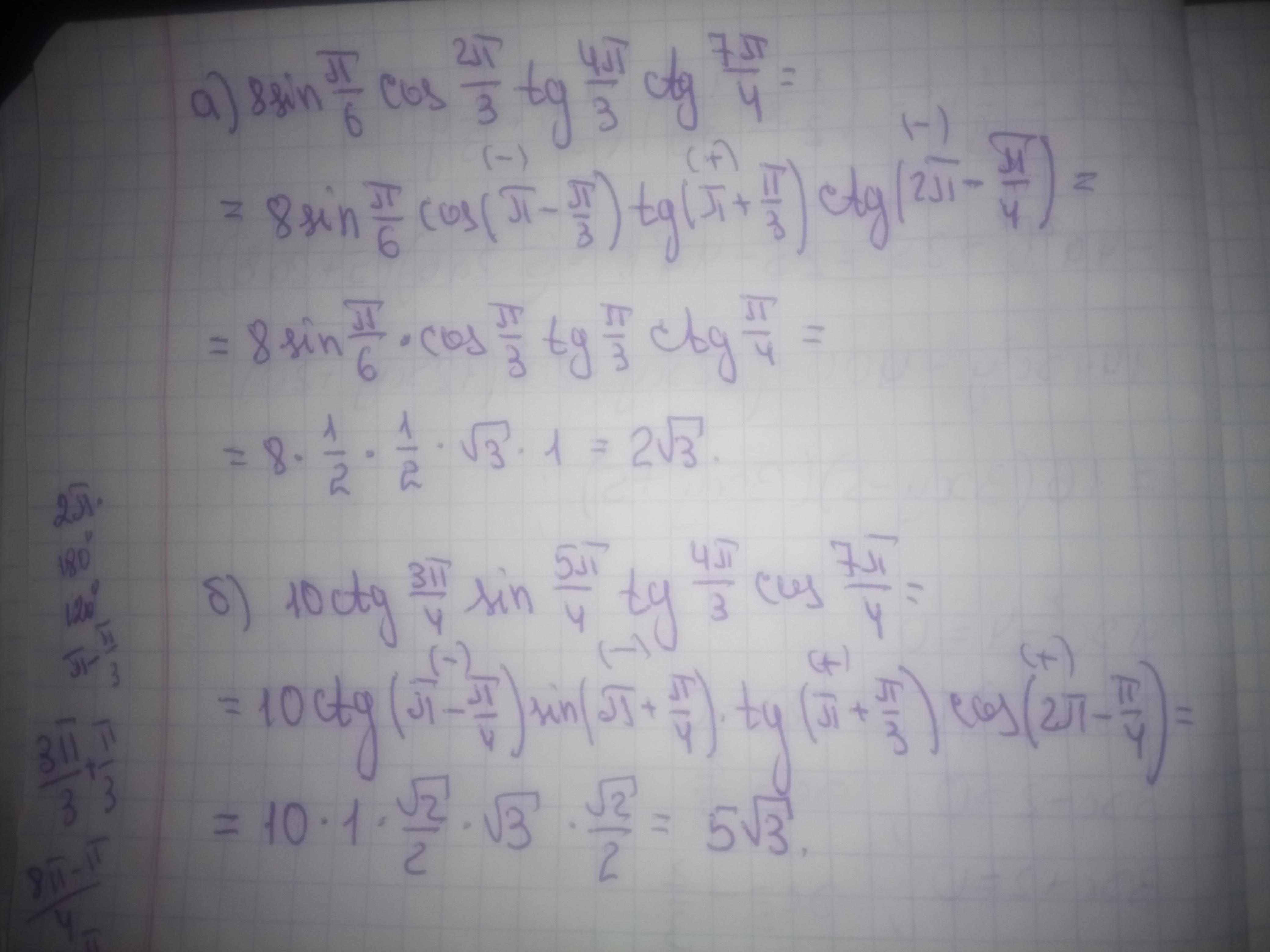 а) 8 sin π/6*cos 2π/3*tg 4π/3*ctg 7π/4=