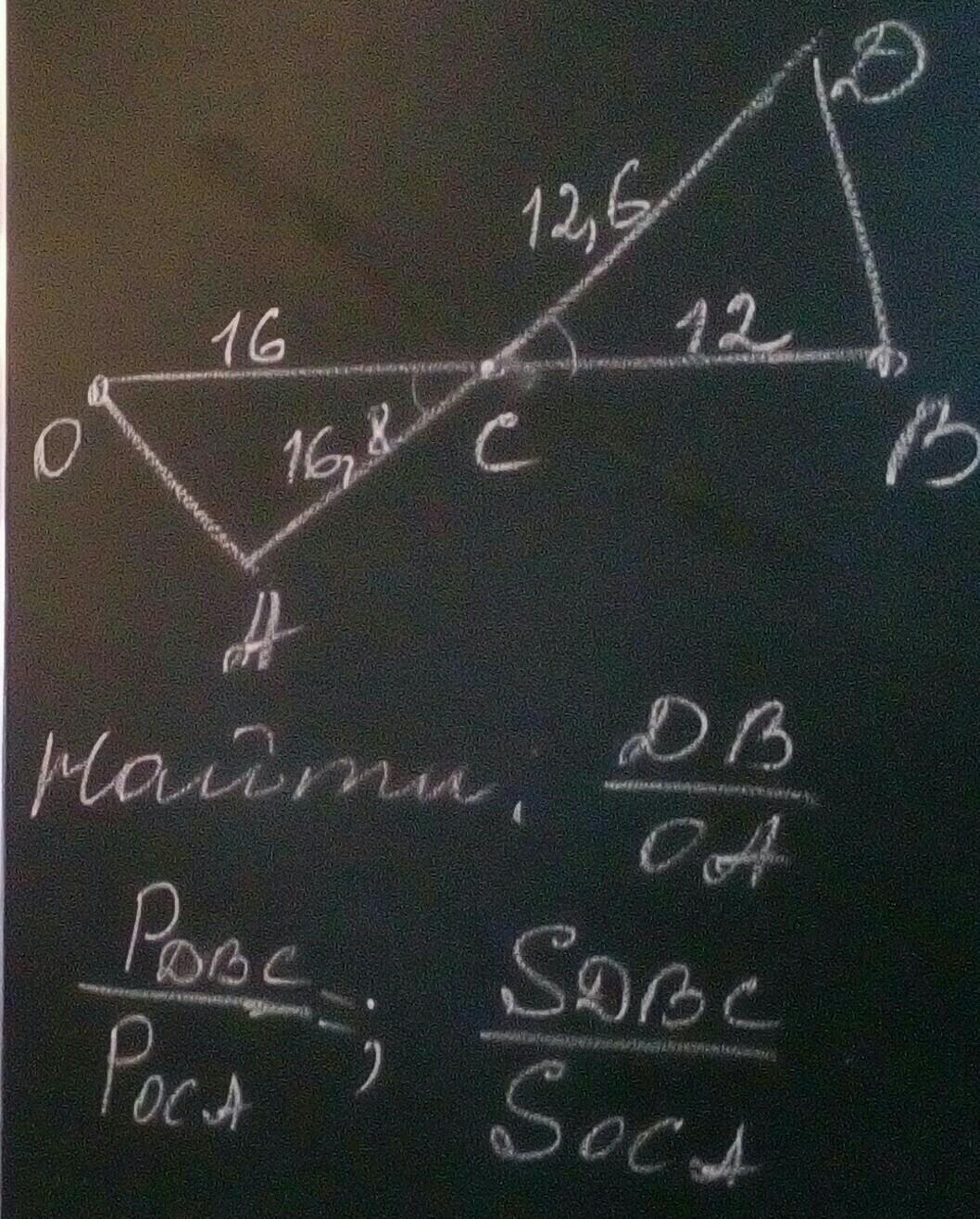Равные углы есть, а стороны ДС/АС(отношение длинных сторон)=БС/ОС(отношение коротких сторон)= 3/4 - коэффициент подобия треугольников или 0,75 .