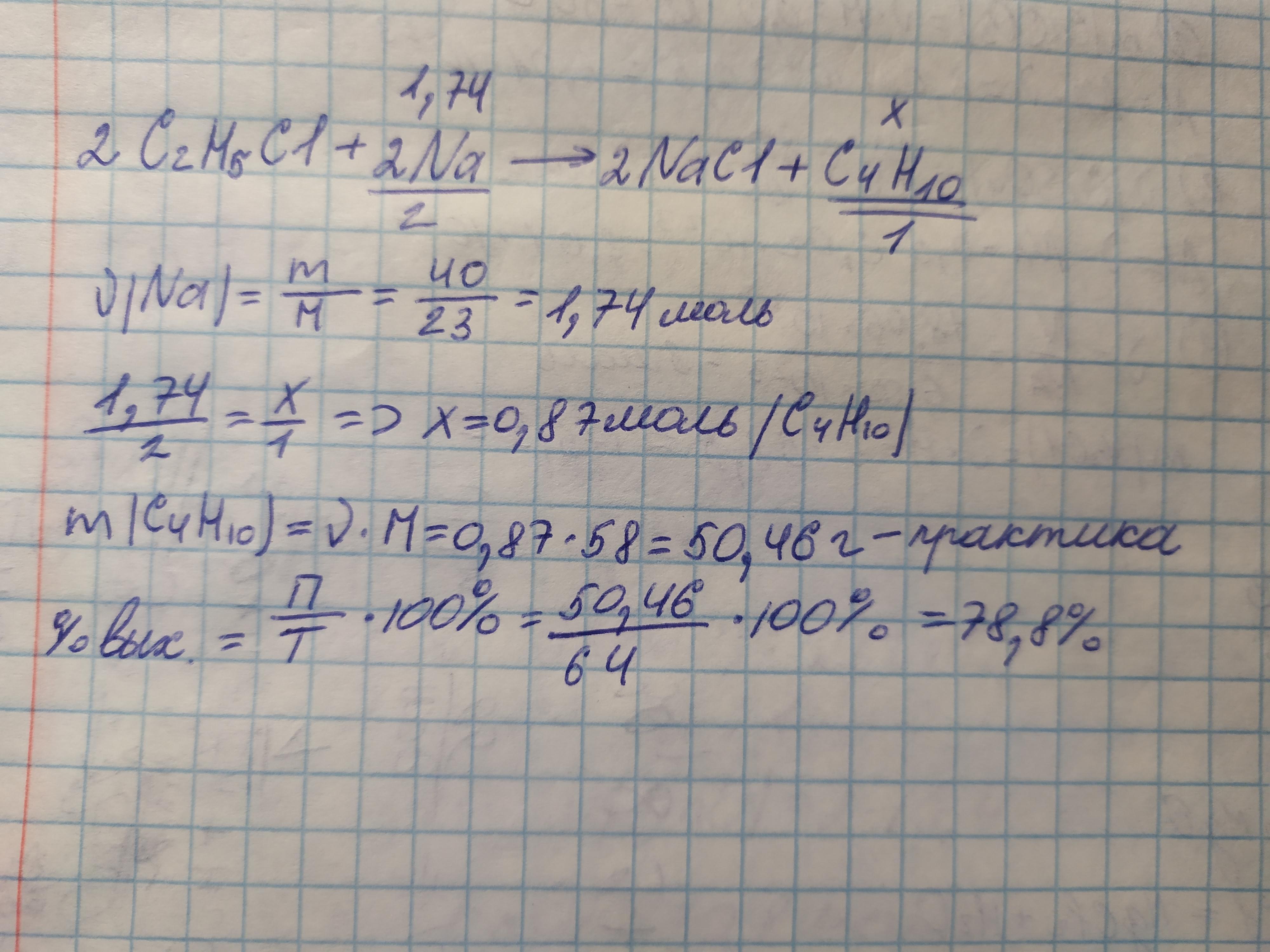 1)При взаимодействии c2h5cl с 40гр Na 64гр C4h10. определите выход.