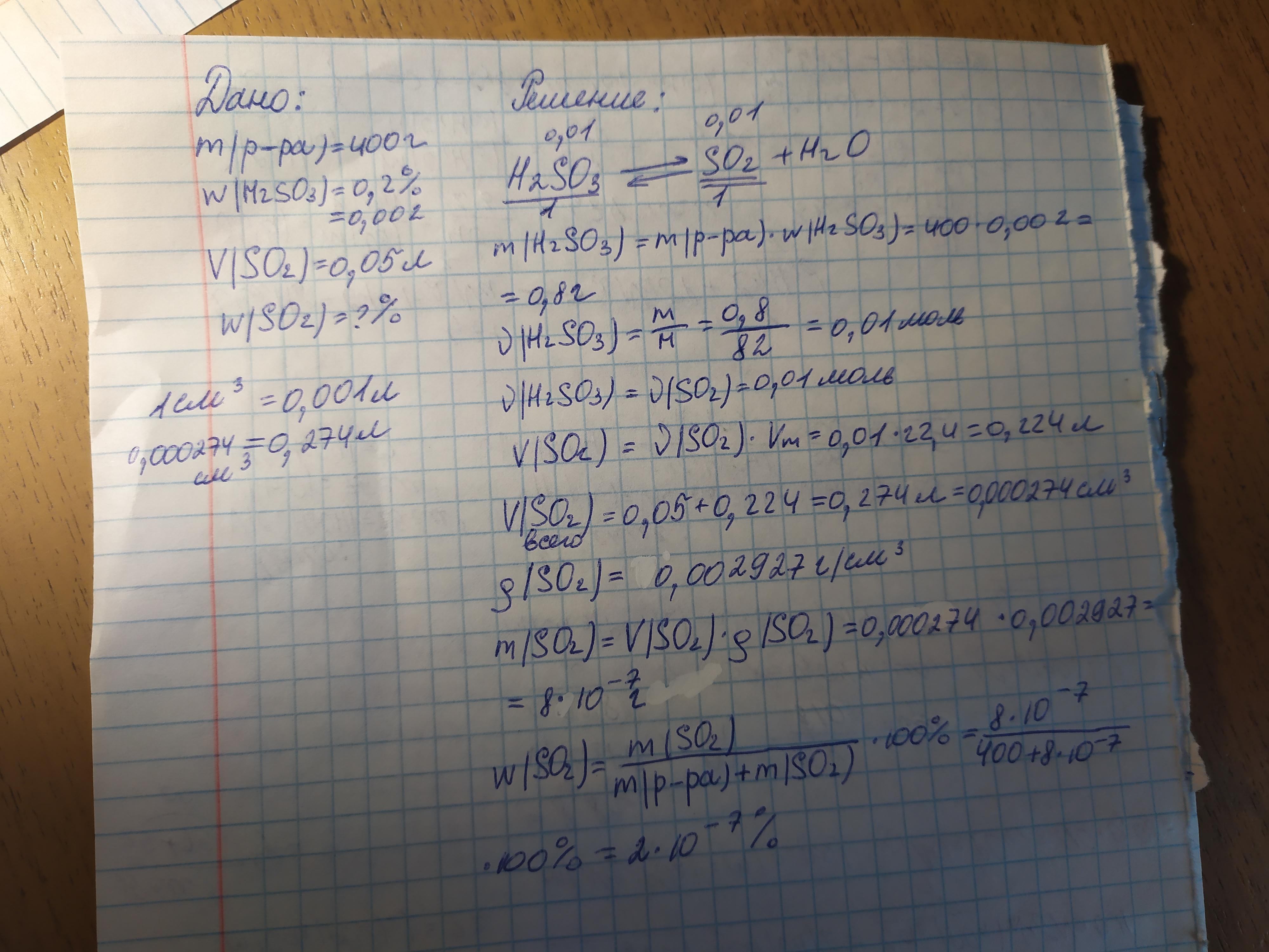 Через раствор сульфитной кислоты массой 400 г с массовой долей кислоты 0,2% пропустили 0,05 л сульфур диоксида. Определите массовую долю вещества (%, до сотых) в полученном растворе.