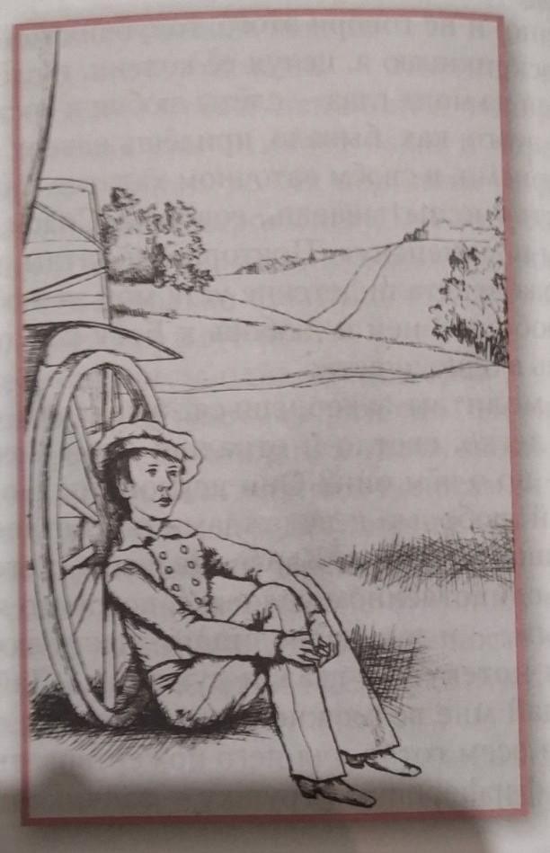 Мальчик сидит подле большого колеса телеги и размышляет. В берете, штанах со стрелками и пиджаком (напоминающим мне пиджак капитана на корабле) парень смотрит на зеленую долину. На холмы с узенькими дорожками. на цветущие кусты сирени. Эдакая деревенская картина! А современными словами village style! (вилладж стайл)