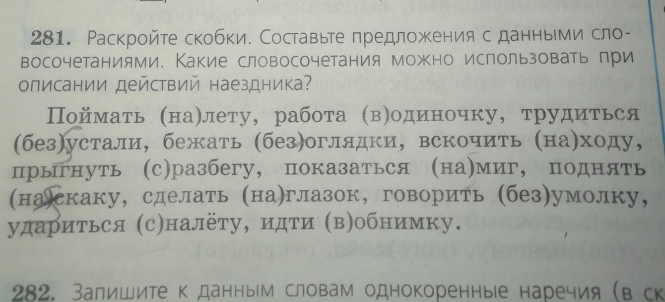 Поймать на лету, работа в одиночку, трудиться без устали, бежать без оглядки, вскочить на ходу, прыгнуть с разбегу, показаться на миг, поднять на скаку, сделать на глазок, говорить без умолку, удариться с налёту, идти в обнимку