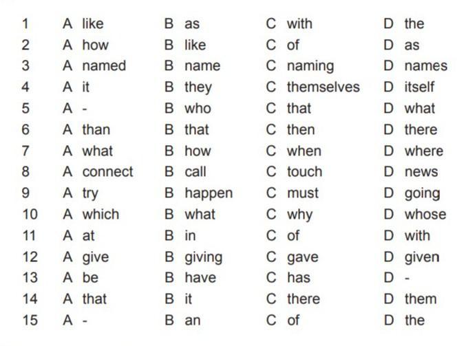 Ответ: 1) as; 2) like; 3) named; 4)themselves; 5) that; 6) than; 7) where; 8) touch; 9) going; 10) why; 11 at; 12) gave; 13) be; 14) it; 15) the