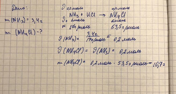 сколько грамм хлорида аммония образуется при взаимодействии 3.4 грамма аммиака с соляной кислотой