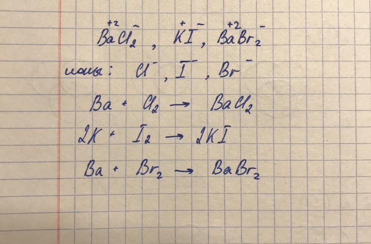 Составьте формулы хлорида бария, иодида калия, бромида бария. Из каких ионов они состоят? Определите заряды ионов по номеру группы элементов в Периодической системе. Составьте уравнения реакций получения этих солей из соответствующих металлов и неметаллов.