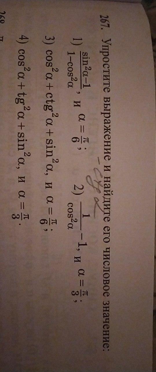 1)\; \; \frac{sin^2a-1}{1-cos^2a}=\frac{-cos^2a}{sin^2a}=-ctg^2a=-ctg^2\frac{\pi}{6}=-(\sqrt3)^2=-3\\\\2)\; \; \frac{1}{cos^2a}-1=1+tg^2a-1=tg^2a=tg^2\frac{\pi}{3}=(\sqrt3)^2=3\\\\3)\; \; cos^2a+ctg^2a+sin^2a=1+ctg^2a=\frac{1}{sin^2a}=\frac{1}{sin^2\frac{\pi}{6}}=\frac{1}{1/4}=4\\\\4)\; \; cos^2a+tg^2a+sin^2a=1+tg^2a=\frac{1}{cos^2\frac{\pi}{3}}=\frac{1}{1/4}=4