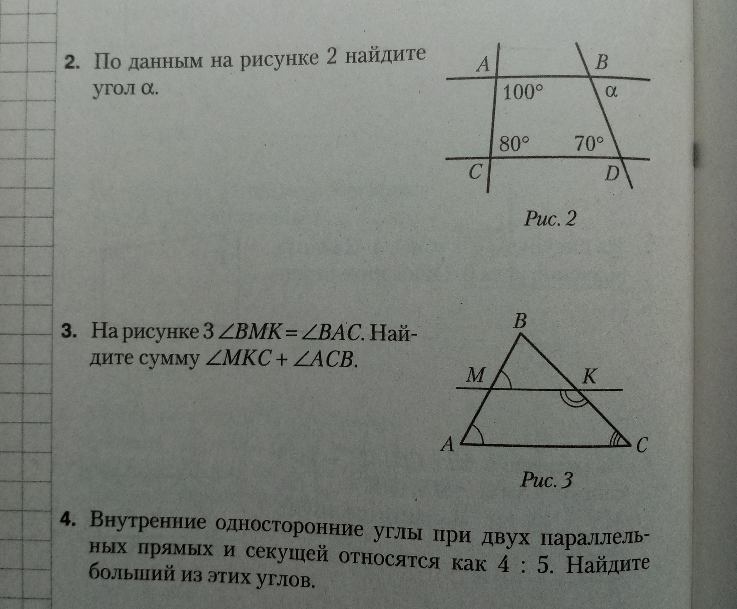 3. Если ∠BMK=∠BAC и они соответственные, то МК║АС. Тогда ∠MKC+ACB=180° - так как сумма внутренних односторонних углов при параллельных прямых и секущей равна 180°.