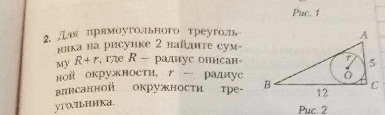 Для прямоугольного треугольника на рисунке 2 найдите сумму R+r, где R-радиус описанной окружности, r-радиус вписанной окружности треугольника