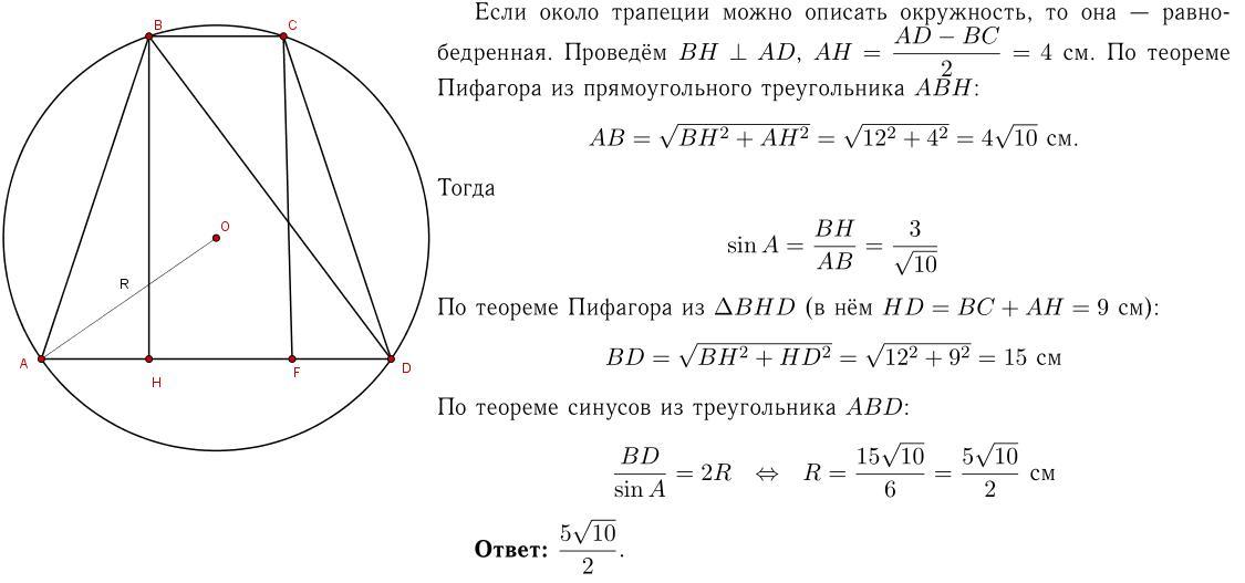 Знайдіть радіус кола описаного навколо трапеції основи якого дорівнюють 5 і 13 см, а висота 12