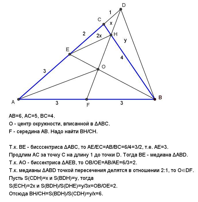 Стороны треугольника равны 4, 5 и 6. Через середину его большей стороны и центр вписанной окружности провели прямую. В каком отношении она делит другую сторону треугольника?