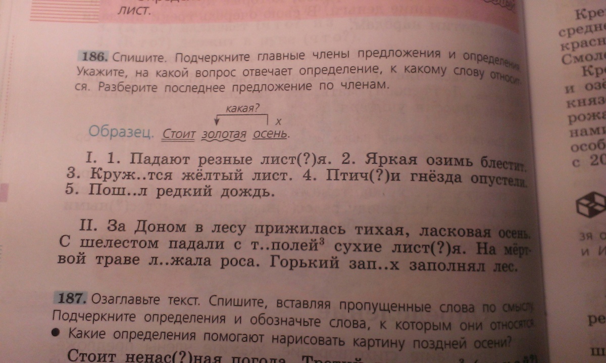 льстья(листья какие? - разные) ,озимь какая?-яяркая,кружится (лист какой? желтый)