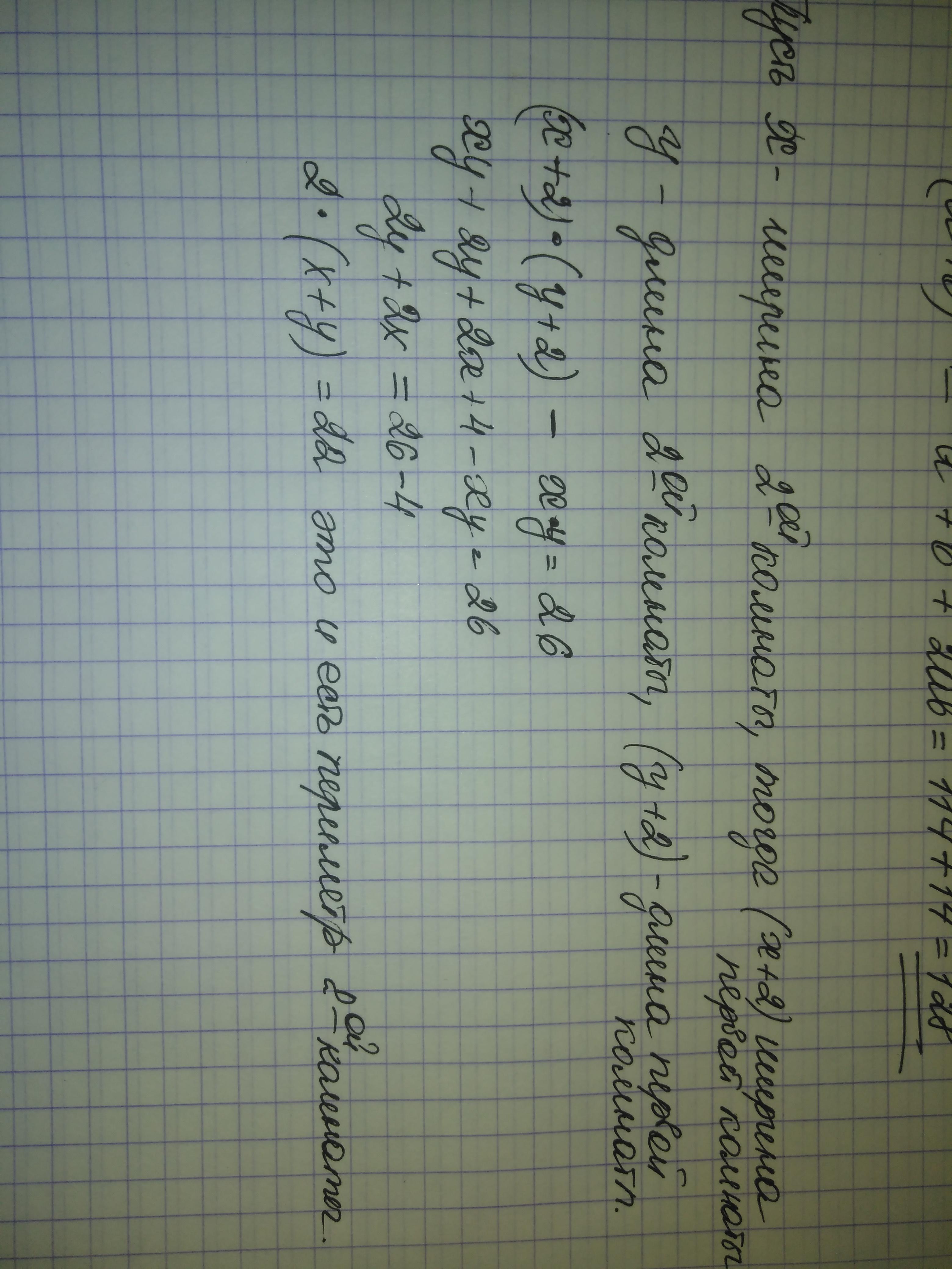 Есть две прямоугольные комнаты. Ширина первой на 2 м больше ширины второй комнаты, длина — на 2 м больше длины второй комнаты, а площадь на 26 м2 больше, чем площадь второй комнаты. Найдите периметр второй комнаты
