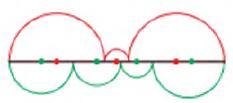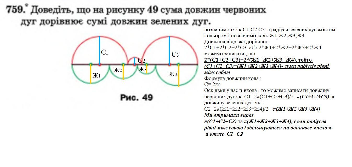 . Доведіть, що на рисунку сума довжин червоних дуг дорівнює сумі довжин зелених дуг.