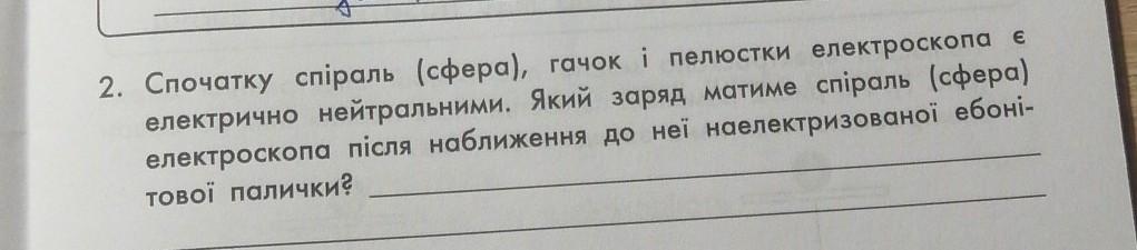 Спочатку спіраль (сфера), гачок і пелюстки електроскопа є електрично нейтральними. Який заряд матиме спіраль (сфера) електроскопа після наближення до неї наелектризованої ебонітової палички?