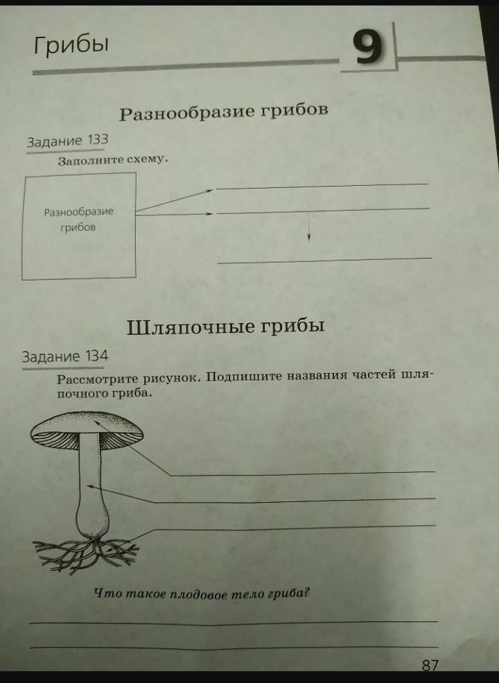 (Задание 134) (верхняя стрелка) - шляпка, (средняя стрелка) - ножка, (нижняя стрелка) - грибница или мицелий.