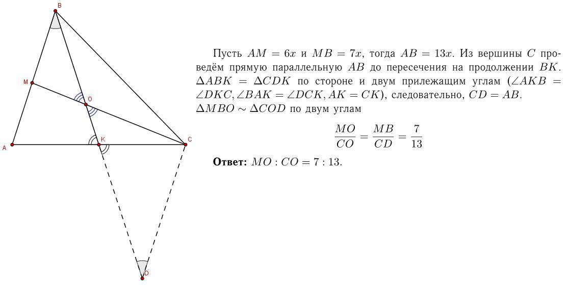 На стороні AB трикутника ABC позначено точку M так, що AM:MB=6:7. У якому відношенні медіана BK ділить відрізок CM?