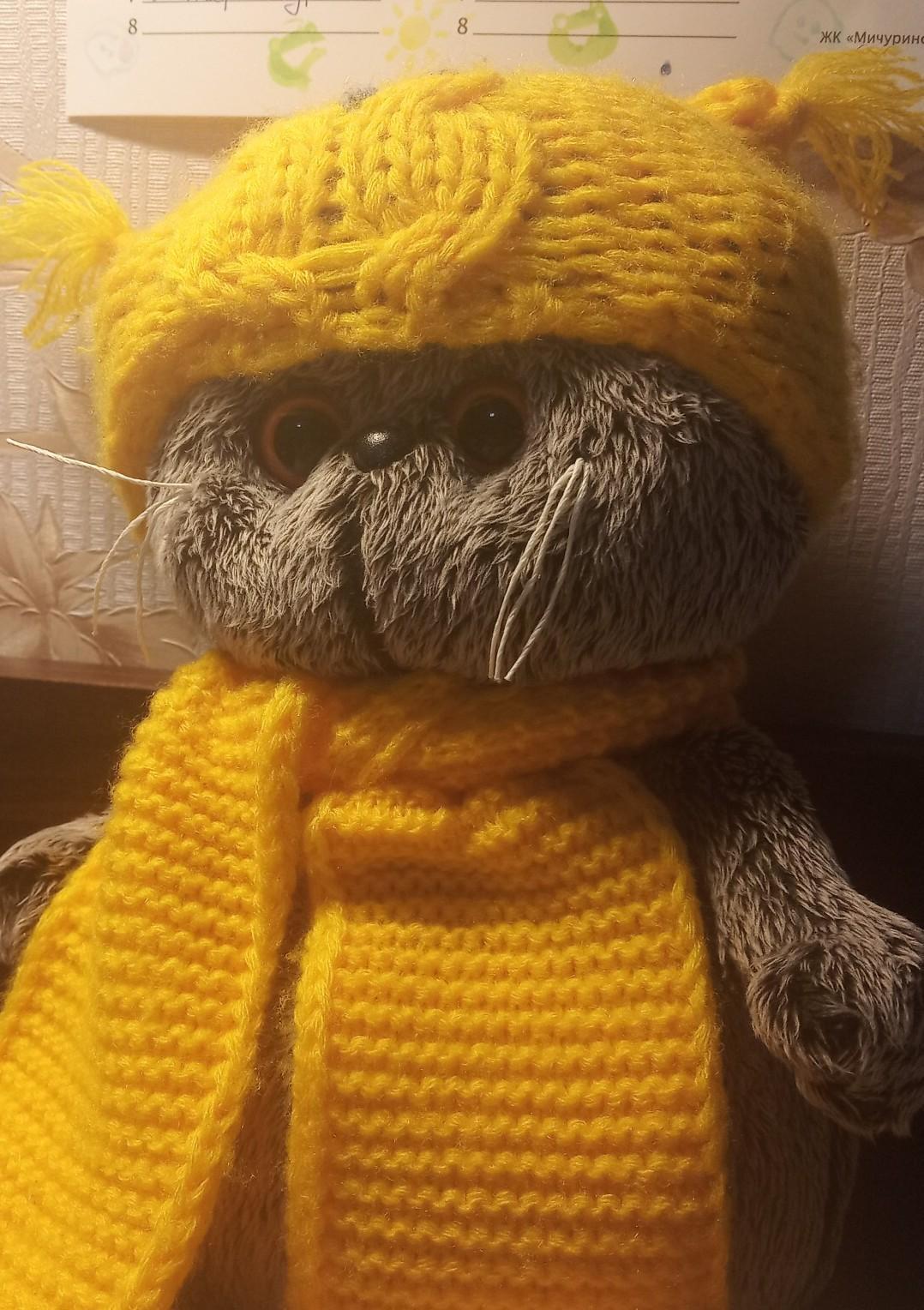 У меня (то есть у тебя) есть игрушечный кот. У него серая шёрстка, есть шапка и шарфик жёлтого цвета, глаза светло-оранжевые, он очень мягкий, и я (то есть ты) его люблю.