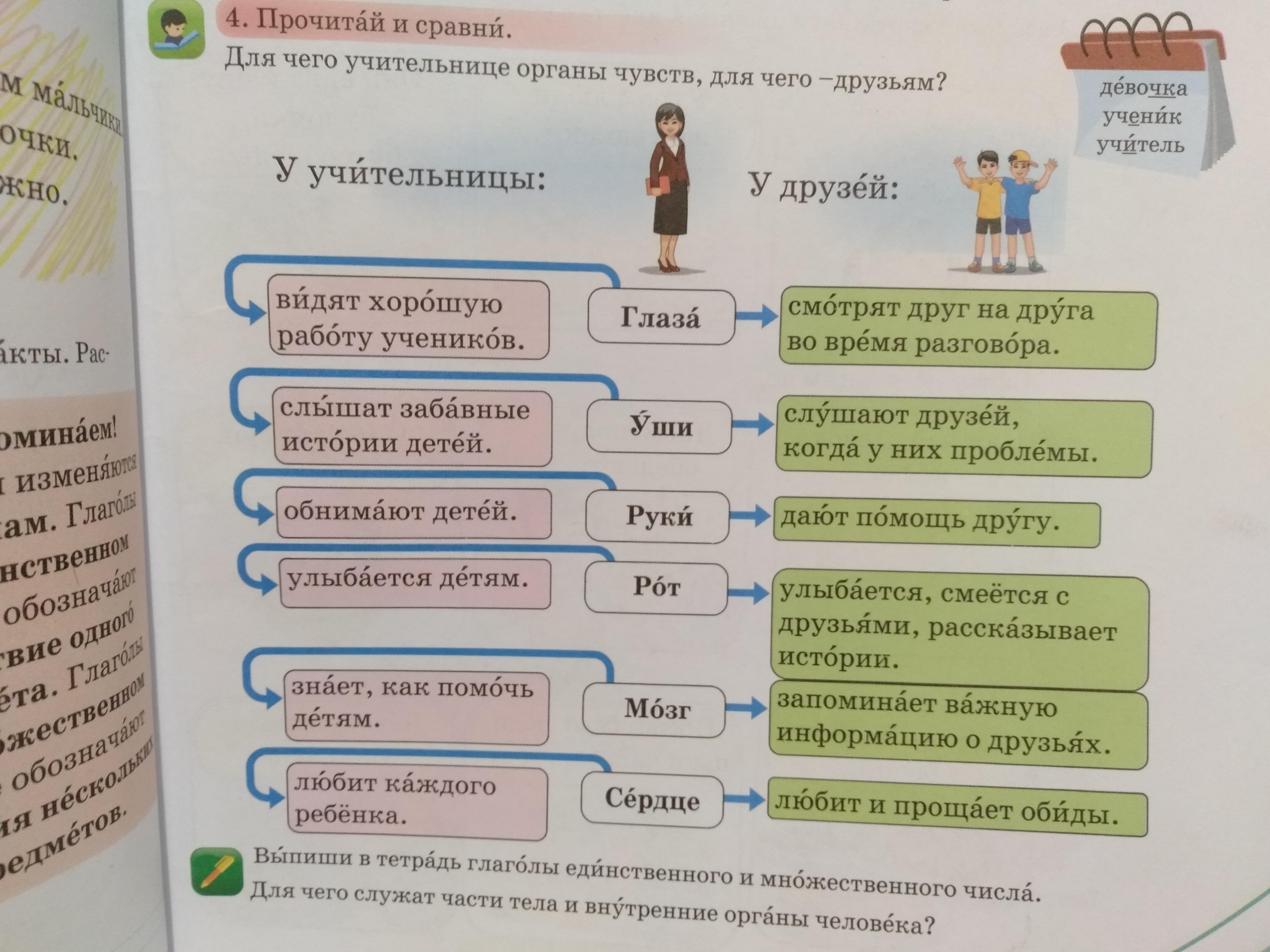 Единственные глаголы :улыбается, знает, любит, улыбается, запоминает, любит, смеётся, рассказывает. Множественные глаголы :видят, слышат, обнимают, смотрят, слушают, дают.