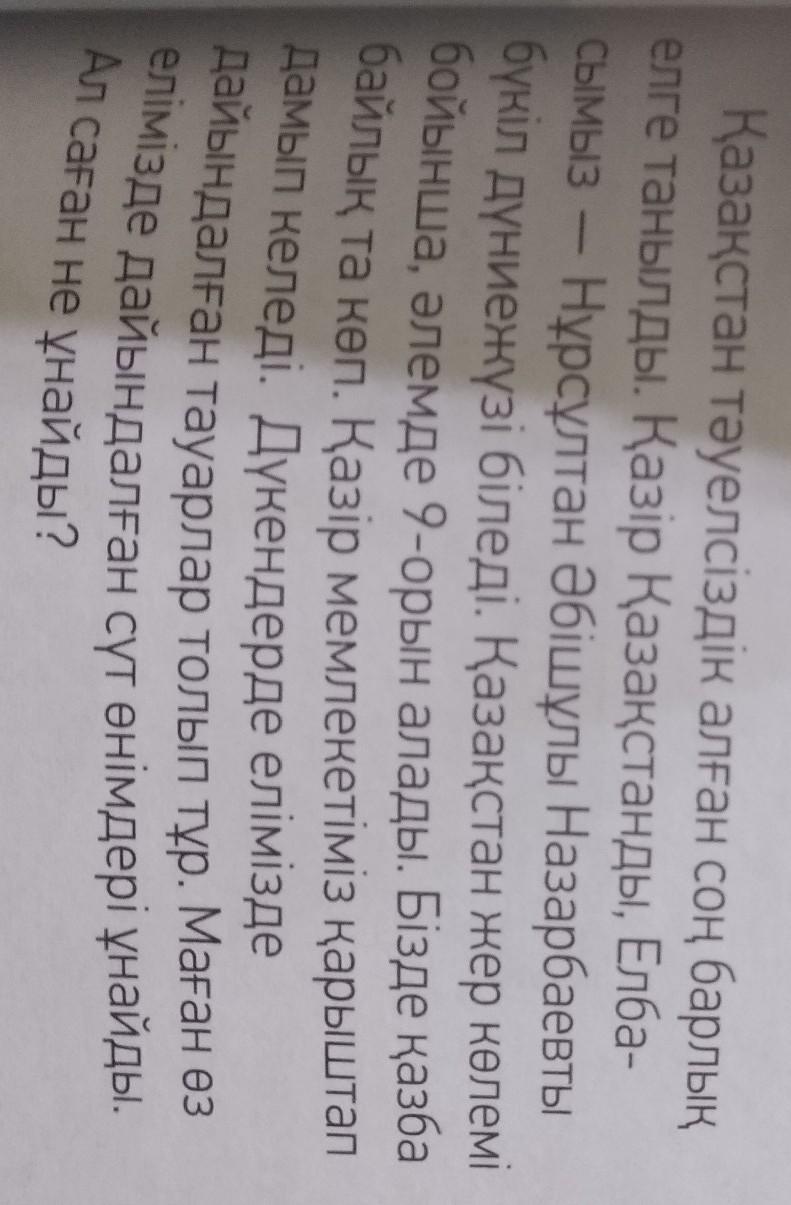 После обретения независимости, Казахстан был признан всей страной. Сейчас весь мир знает про Казахстан, знает нашего Президента - Нурсултана Абишевича Назарбаева. Казахстан занимает 9 место в мире по площади земли. У нас много богатых ископаемых. Сейчас государство динамично развивается. В магазинах очень много товаров, изготовленные в нашей стране. Мне нравится молочная продукция, которую изготавливают в нашей стране