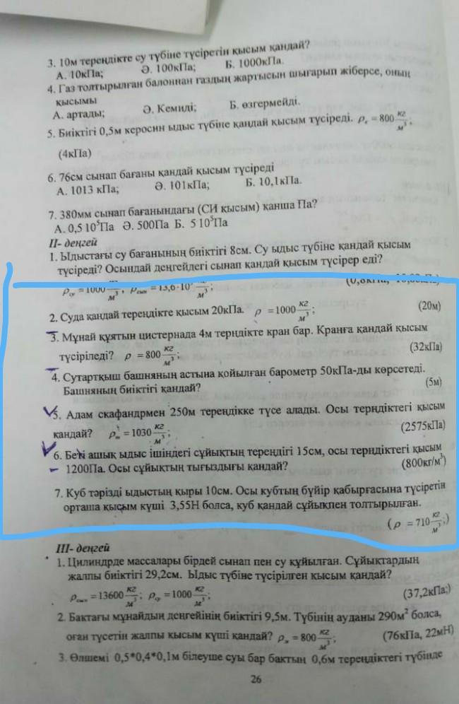 2. На какой глубине воды Плотность 20 кПа 3. Бак с краном глубиной 4м. Какое давление крана? Плотность -800 4. Барометр под резервуаром для воды показывает 50 кПа. Какой рост у Башнян? 5Человек может подняться на глубину до 250 м с эскадрой. Какое давление здесь? Плотность= 1030 6. Глубина жидкости в открытом сосуде составляет 15 см, объем в этом случае составляет 1200 Га. Какой плотность?