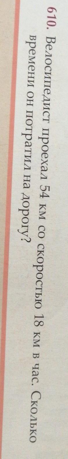 Если у нас проехал велосипедист проехал 54км со скоростью 18 км/ч то нужно поделить 54км на 18км/ч