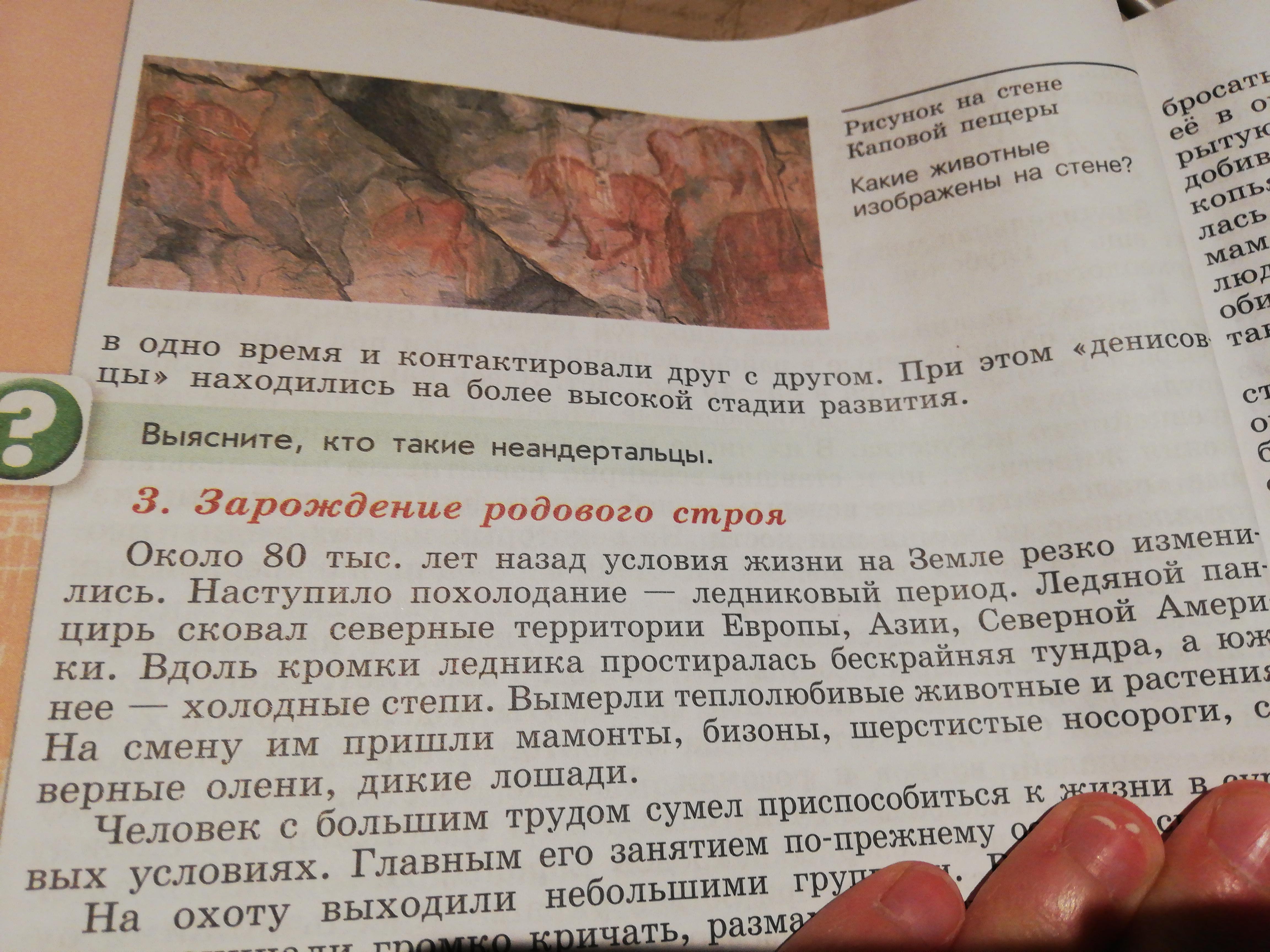 Еще одна такая стоянка - Сунгирь. Она была образована около 25 тыс. лет назад. Находится она под Владимиром. Здесь также были обнаружены личные вещи людей. Охотились они на мамонтов росомах и других животных. Ученые восстановили примерный их облик. Она очень похожа на одежду нынешних коренных народов тех земель. Они очень богато украшали свою одежду золотом и кусочками костей мамонта. Древние люди не только охотились и занимались собирательством, но и отражали свою жизнь в искусстве, так в Южном Урале в 1959 году в пещере были обнаружены наскальные рисунки. Причем рисунки были составлены из таинственных геометрических фигур. Подобные рисунки также были найдены на юге Франции. Также стоянки уже более современных (похожих на нас) ученые недавно нашли около Денисовой пещеры.
