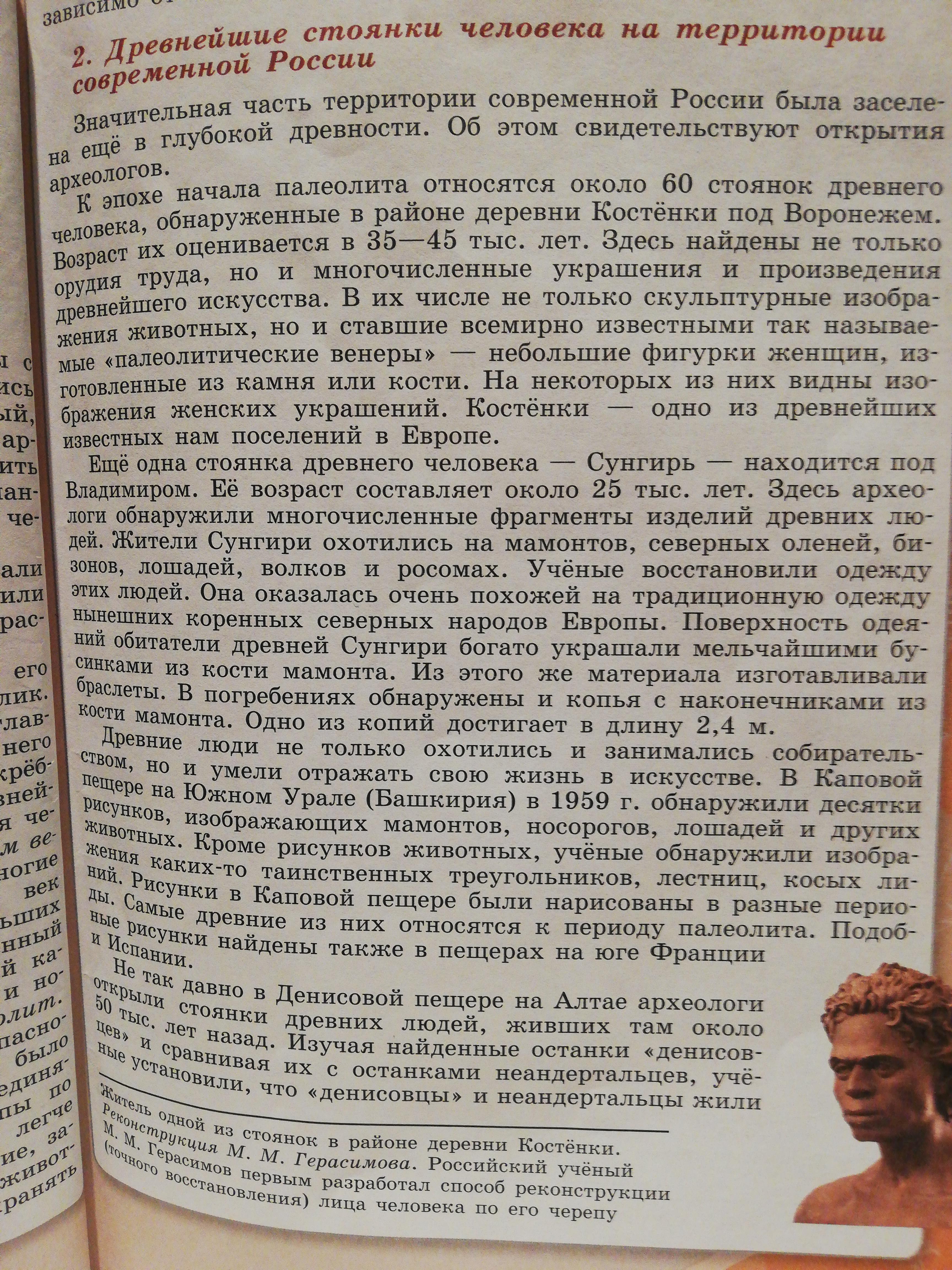 Переписываешь 1-й абзац. Первая стоянка древнего человека под Воронежем появилась около 40 тыс. лет назад под деревней Костенки. Там были найдены предметы быта и культуры, а также фигурки женщины под названием палеолитические венеры. На некоторых из них были изображены женские украшения. Костенки это одна из древнейших стоянок людей того времени.