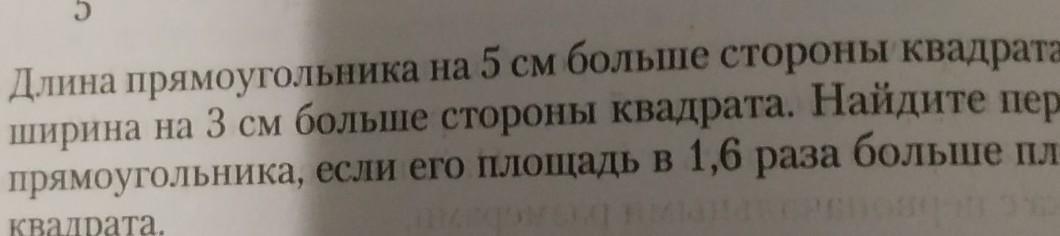 Длина прямоугольника на 5 см больше стороны квадрата а его ширина на 3 см больше стороны квадрата Найдите периметр прямоугольника если его площадь в 1,6 раза больше площади квадрата