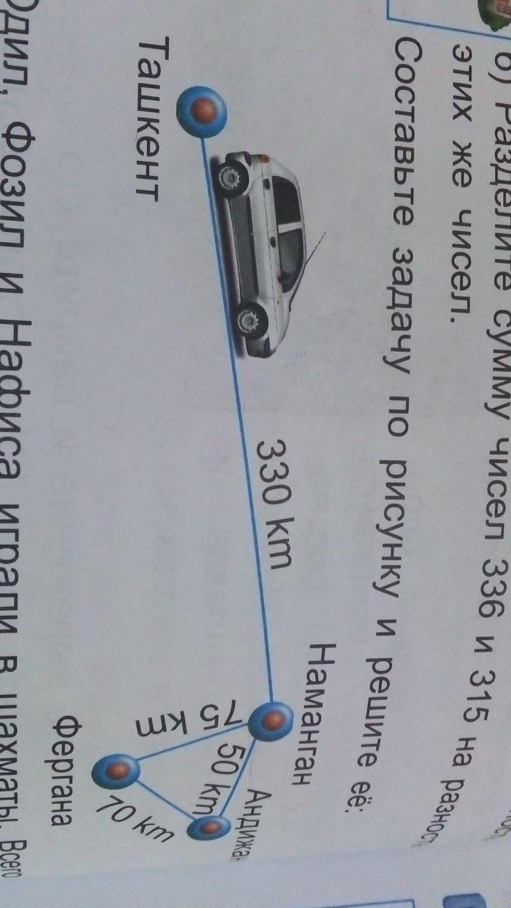 составить задачу по картинке 3 кл.Ташкент Наманган 330 км,Наманган Андижан 50 км,Андижан Фергана 70км ,Наманган Фергана 75км