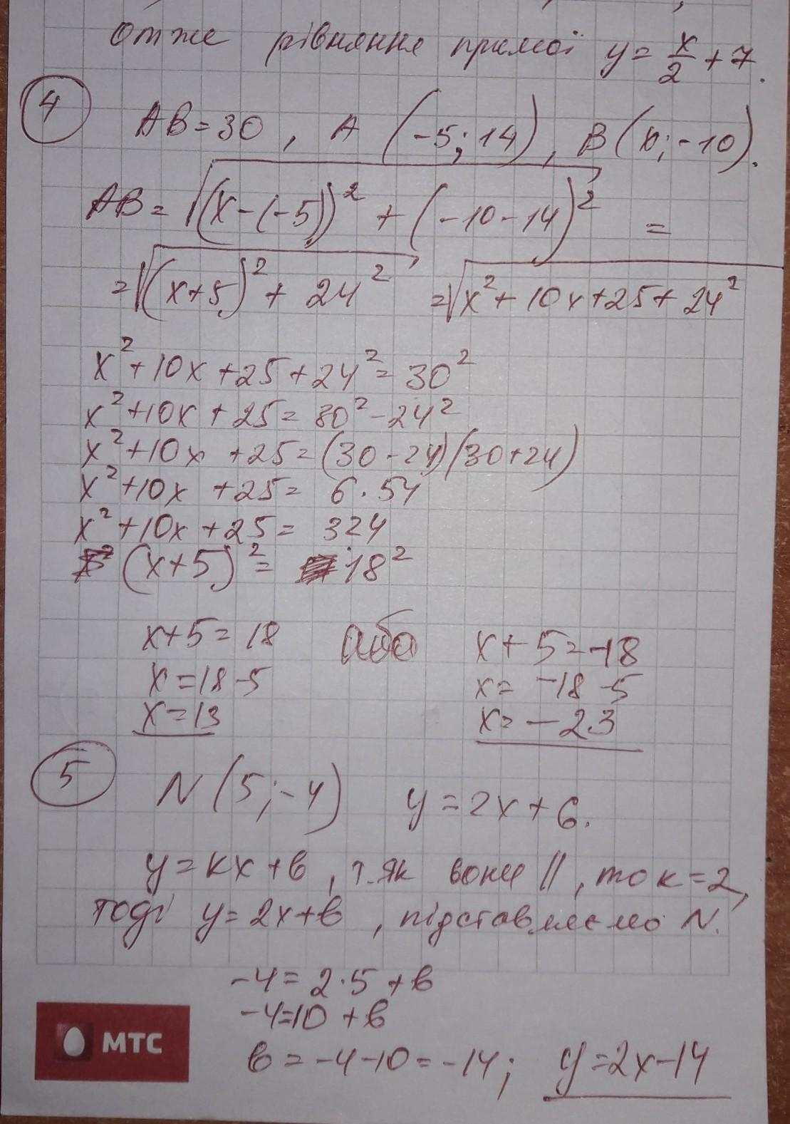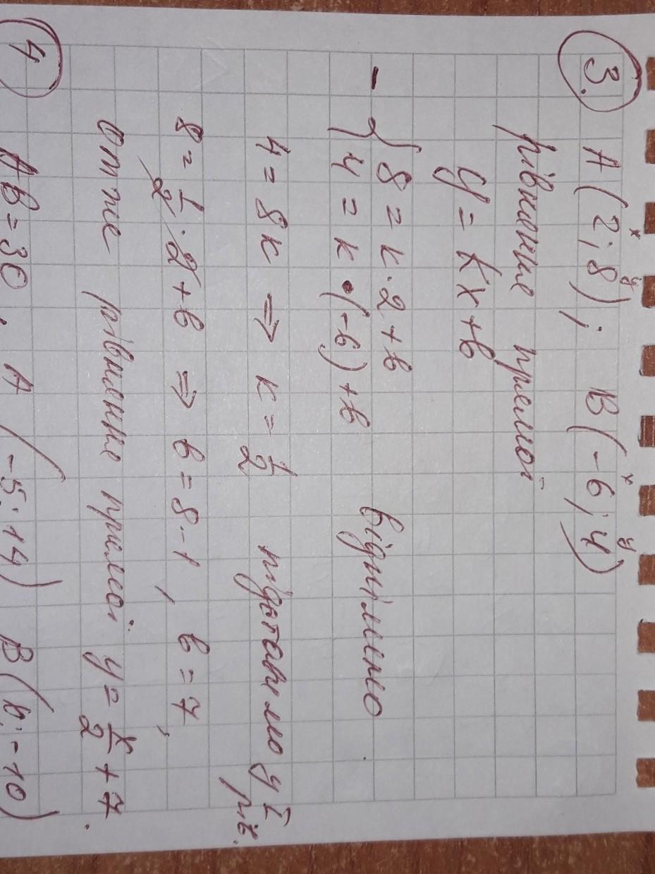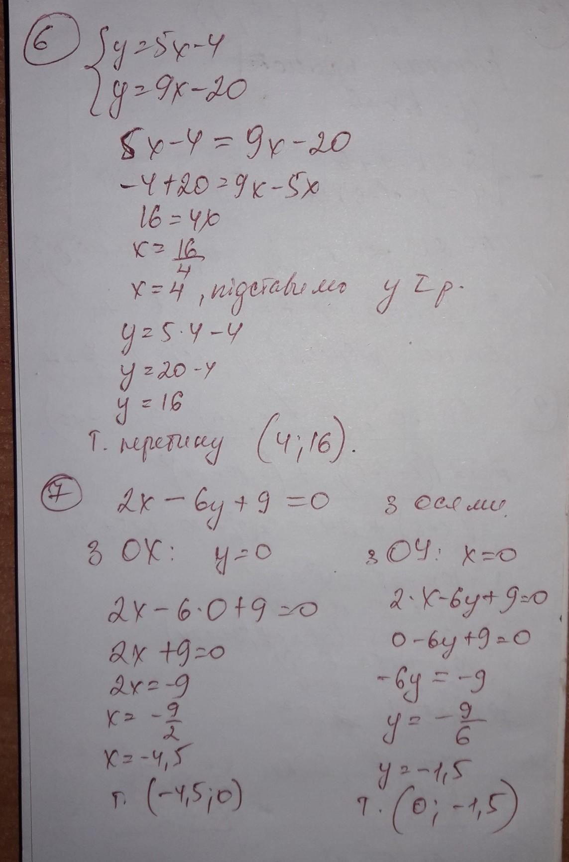 3.Скласти рівняння прямої, яка проходить через точки А( 2; 8 ) і В( - 6; 4 ) ) 4.При якому значенні х довжина відрізка АВ буде дорівнювати 30, якщо А( - 5; 14) і В( х; - 10) ? 5. Скласти рівняння прямої, яка проходить через точку N( 5; - 4) і паралельна прямій у = 2х + 6 6. Знайти точку перетину графіків функцій у = 5х – 4 і у = 9х ⎯ 20 7. Знайти точки перетину графіка функції 2х ⎯ 6у + 9 = 0 з осями координат
