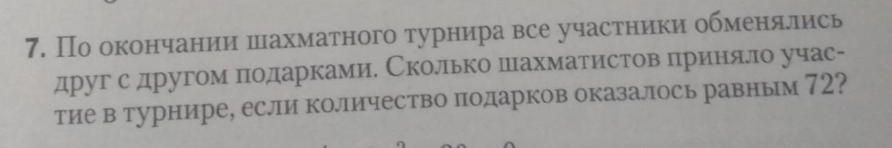 Пусть шахматистов было х человек, каждый из них купил (х-1) подарков. Так как всего подарков было 72, то х(х-1)=72. Т.е мы должны найти 2 последовательных числа, произведение которых =72.Это числа 8 и 9.