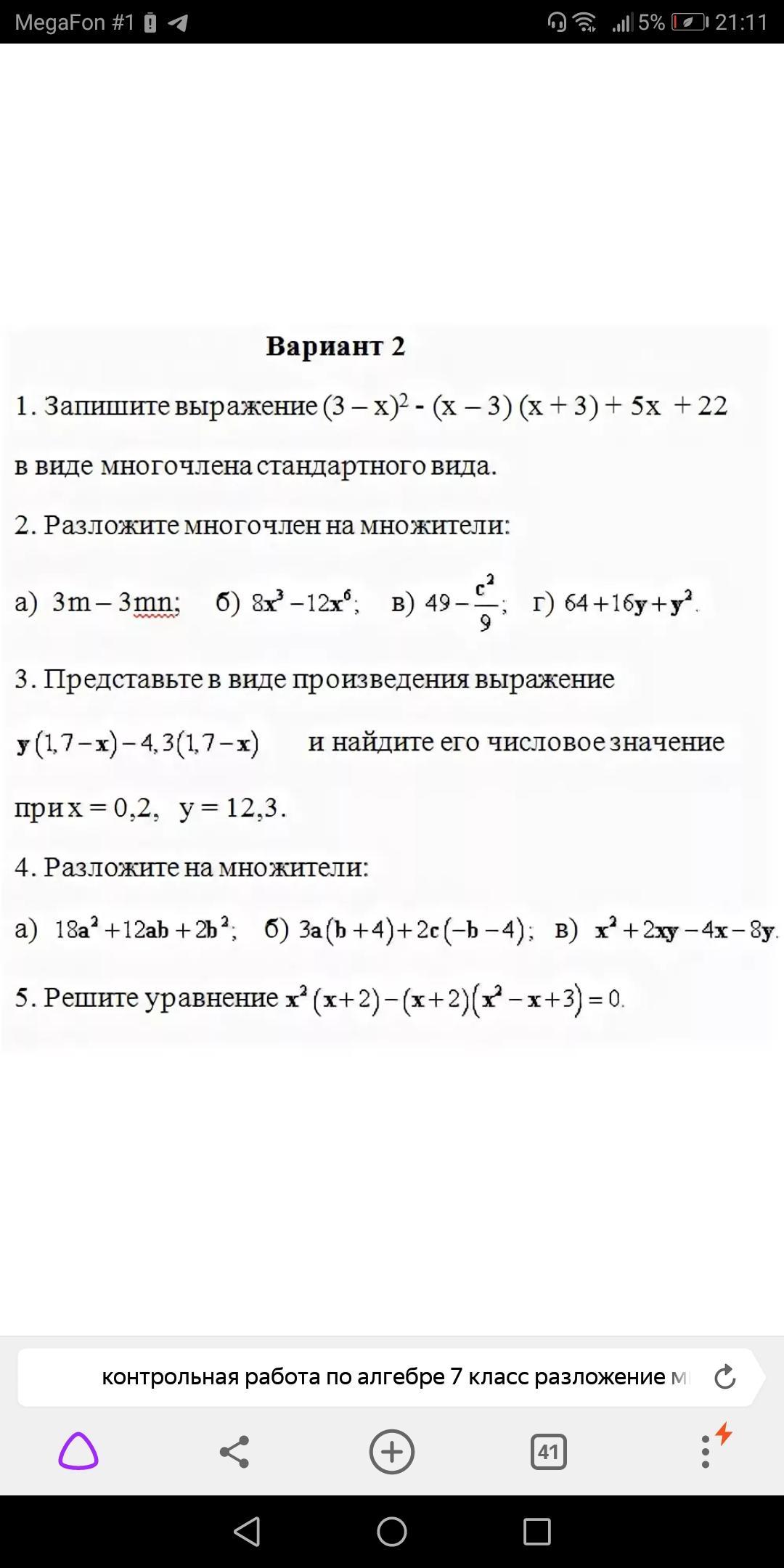 a)3m-3mn=3m(1-n) б)8x³-12x^6=4x³(2-3x³) в)49-c²/9=(7-c/3)(7+c/3) г)64+16y+y²=(8+y)²
