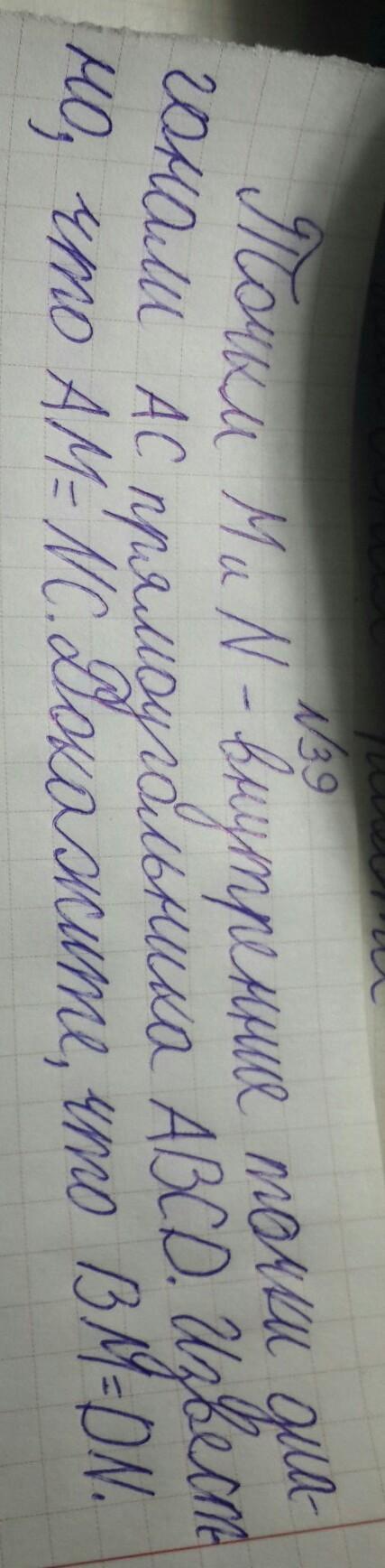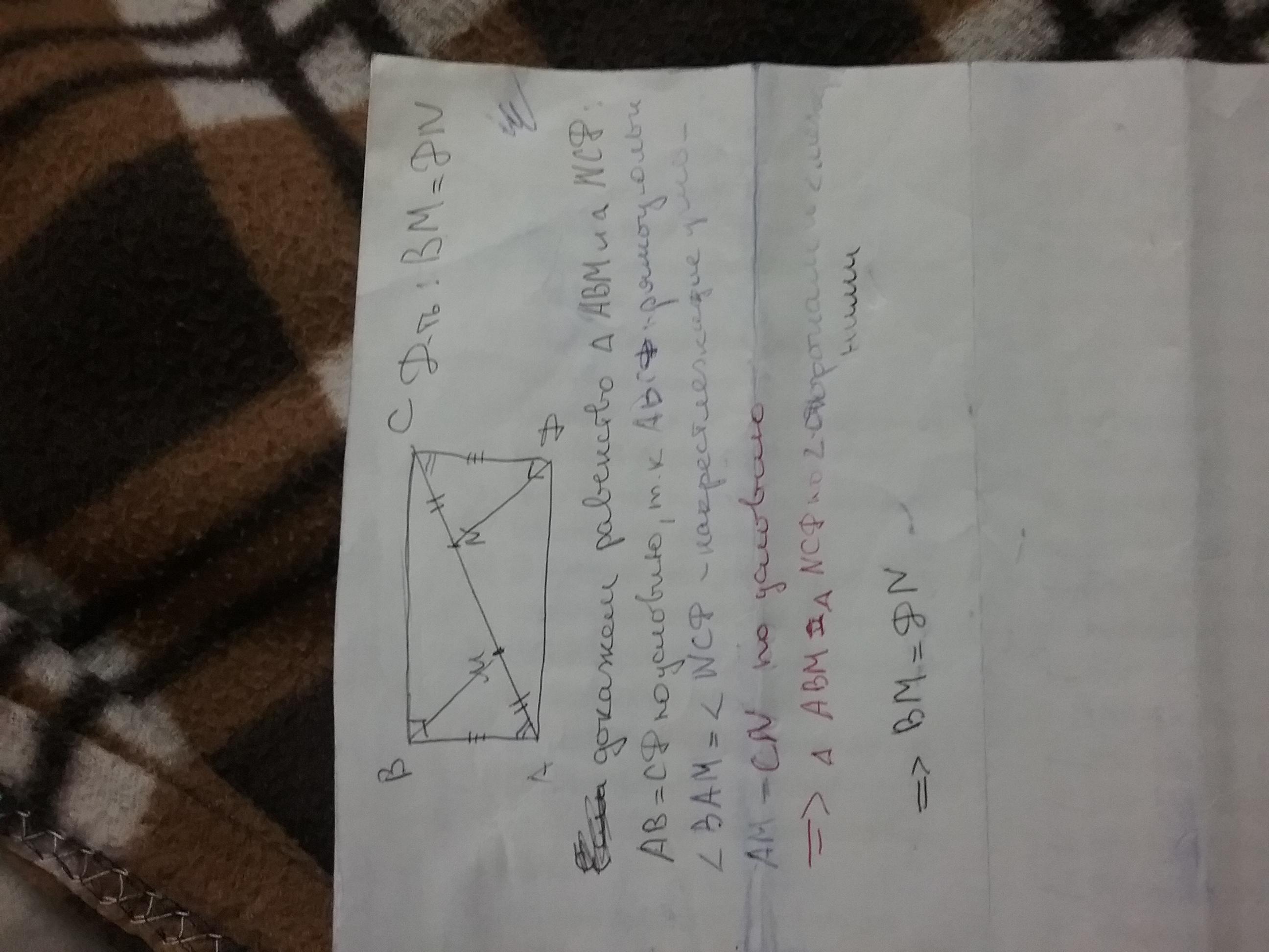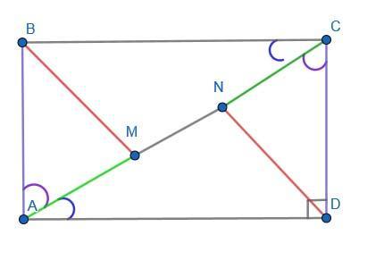Точки M и N - внутрение точки диагонали AC прямоугольника ABCD. Известно, что AM=NC. Докажите, что BM=DN.
