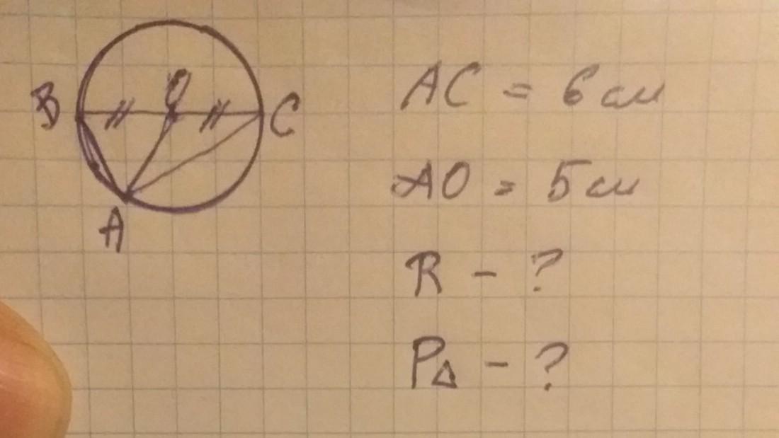 АО = ВО = ОС как радиусы так как и В, и А, и С лежат на окружности. Угол ВАС опирается на диаметр, а по св-ву угла с вершиной на окружности и пересекающими окружность сторонами, его градусная мера в два раза меньше дуги, на которую он опирается т.е. угол ВАС = 1/2 * 180° = 90°. Почему 180°? Так как опирается на диаметр, а значит отсекает ровно половину окружности, т.е. 1/2 * 360° = 180°. ВС = 2 * АО = 10 см. Теперь теорема Пифагора для прямоугольного треугольника ВАС: АС^2 + ВА^2 = ВС^2 <=> ВА^2 = ВС^2 - АС^2 = 100 - 36 = 64 Значит ВА = 8, а периметр треугольника ВАС Р = 8 + 6 + 10 = 24 см.
