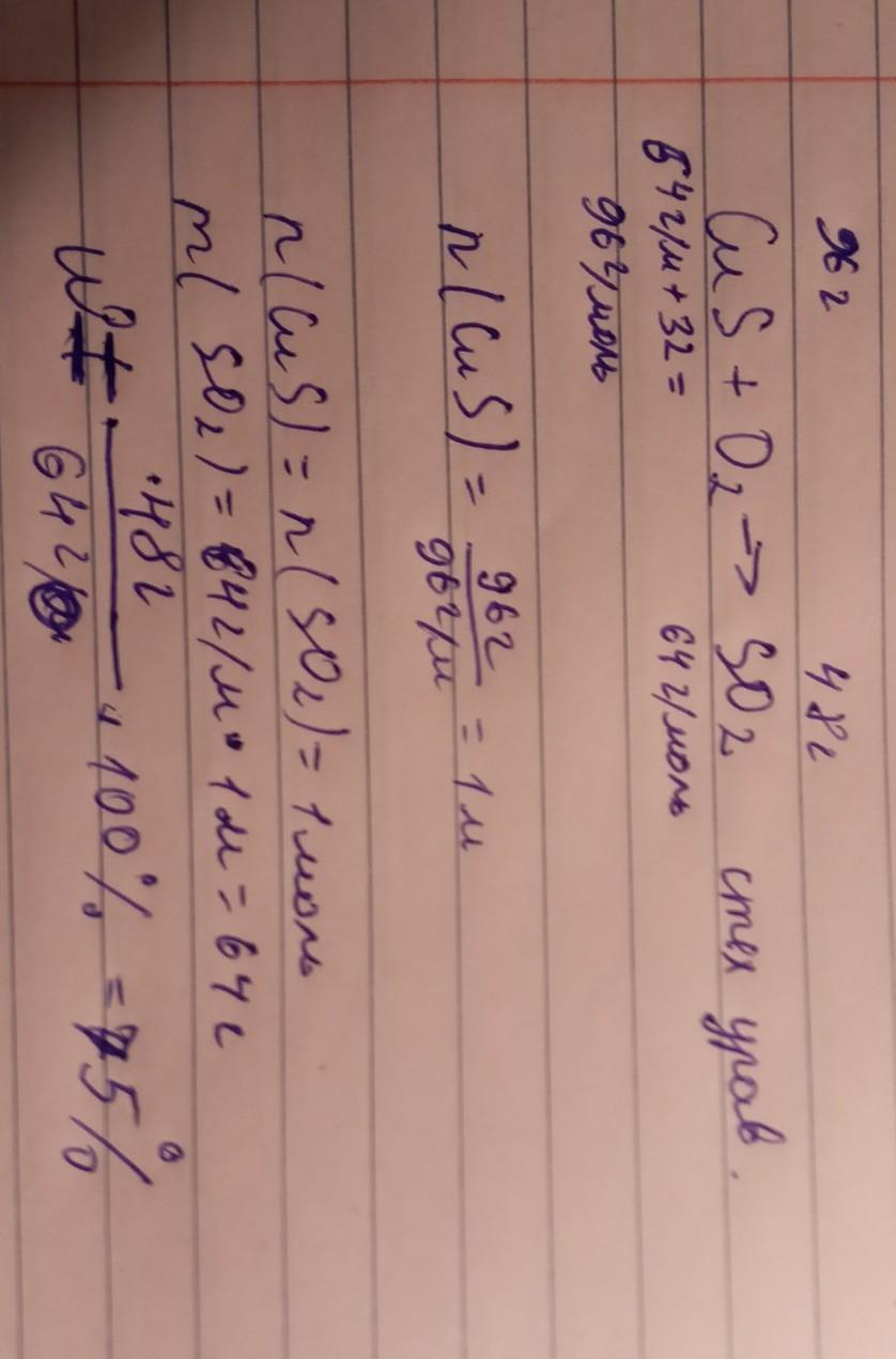 Вычислите, выход продукта реакции оксида серы (1V) от теоретически возможного, если при сгорании 96г сульфида меди получено 48 г SO2
