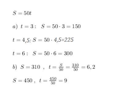 Функция задача формулой S=50t,где S путь (в км) и t время в ч.Определите а) S,если t=3;4,5;6б) t,если S=310;450