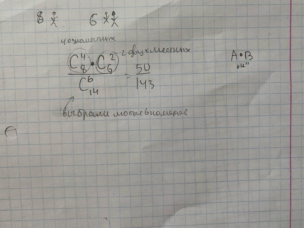 Есть 8 одноместных и 6 двухместных номеров. Найти вероятность того, что из 6 случайно выбранных номеров будут 4 одноместных и 2 двухместных номеров.