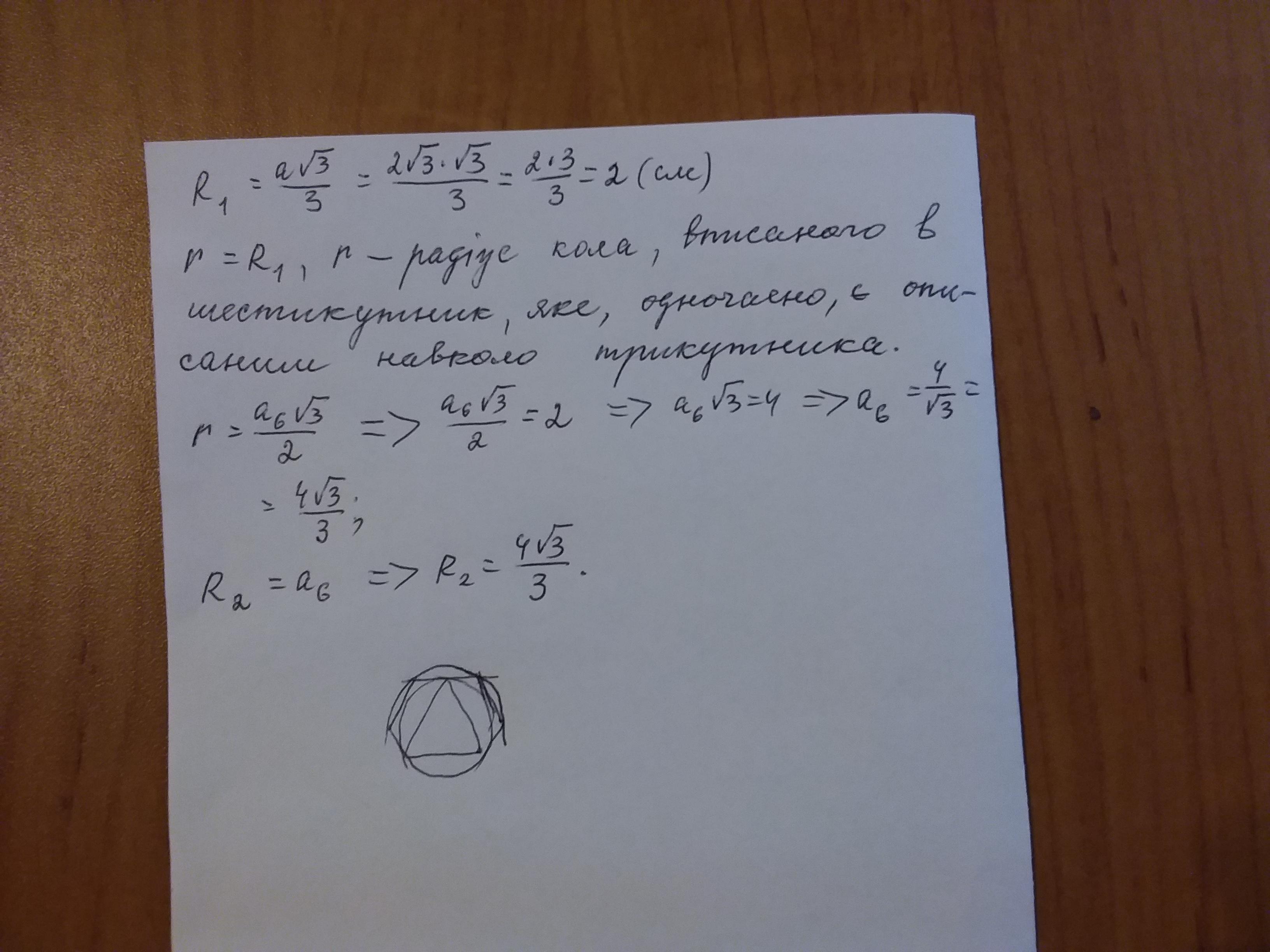 Навколо правильного трикутника із стороною 2√3 см , описано коло 1
