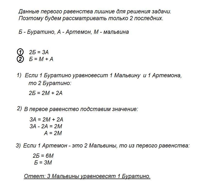 Дуремар весит столько же, сколько Буратино и Мальвина: Д = Б + М.