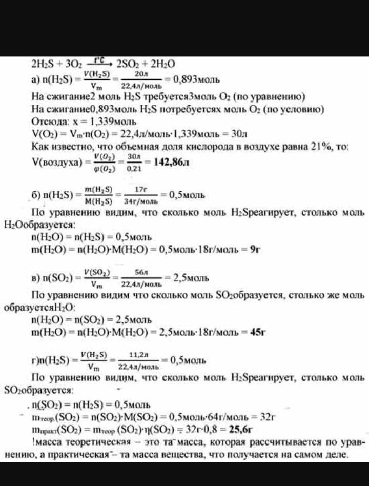 г) массу оксида серы(IV), образующегося при сгорании 11,2 л (н.у.) сероводорода, если реакция шла с выходом 80%
